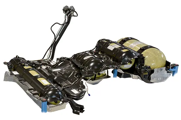 Running vehicles on Compressed Natural Gas (CNG) is a quick, cost-effective alternative to gasoline or diesel that can help manufacturers comply with the European Union (EU) directive on reducing CO2 emissions. Magna develops and manufactures high-quality dual-fuel CNG fuel-tank systems. These fuel tank systems consist of a deep-drawn plastic tank for gasoline and several CNG type IV containers. All the components, including mandatory impact protection, are accommodated in a single frame, so installing them in the vehicle is quick, simple and safe.